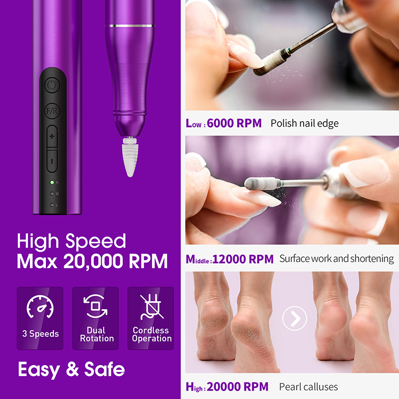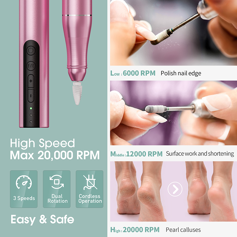 فایل های ناخن حرفه ای با 3 سرعت 6000-12000-20000 طراحی شده است، فقط کافی است دکمه + یا - را برای افزایش یا کاهش سرعت فشار دهید. تنظیم سرعت آسان و صرفه جویی در زمان هنگام تیز کردن ناخن ها. جهت مته را می توان به راحتی با فشار دادن دکمه F/R تغییر داد، ایده آل برای افراد چپ دست، متخصصان ناخن و یا مبتدیان برای مراقبت از ناخن.
