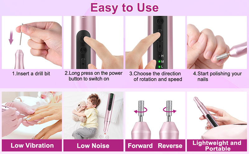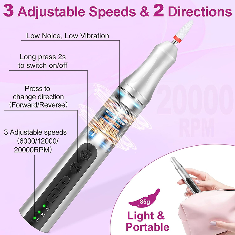 فایل های ناخن حرفه ای با 3 سرعت 6000-12000-20000 طراحی شده است، فقط کافی است دکمه + یا - را برای افزایش یا کاهش سرعت فشار دهید. تنظیم سرعت آسان و صرفه جویی در زمان هنگام تیز کردن ناخن ها. جهت مته را می توان به راحتی با فشار دادن دکمه F/R تغییر داد، ایده آل برای افراد چپ دست، متخصصان ناخن و یا مبتدیان برای مراقبت از ناخن.