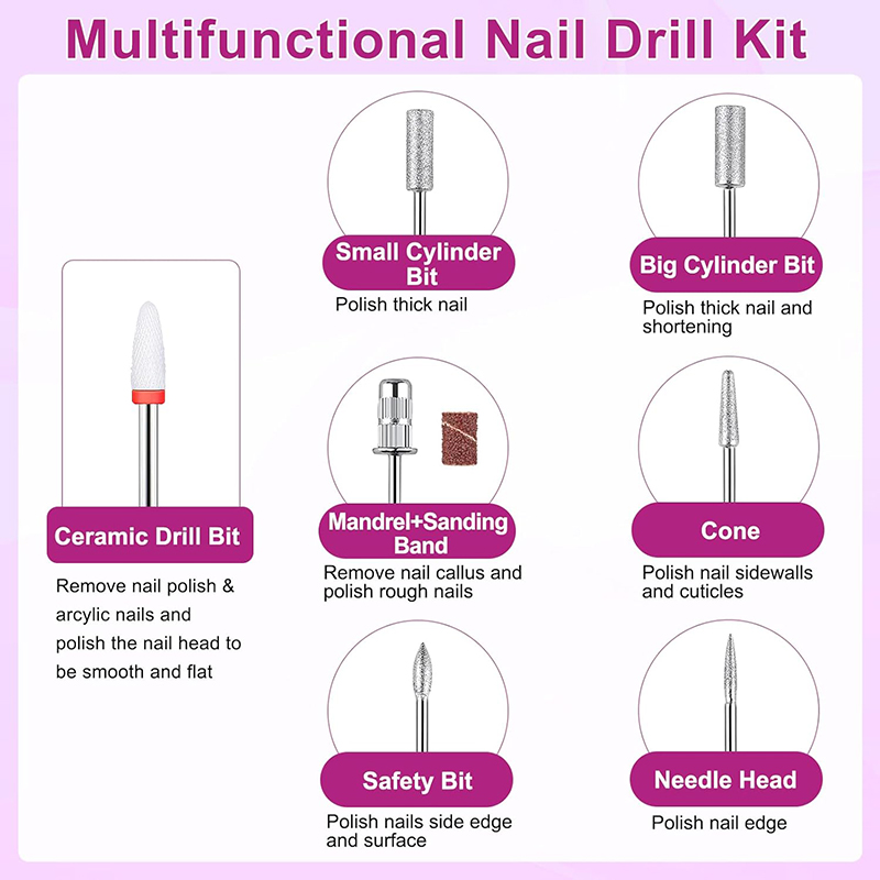 دستگاه دریل ناخن شامل 6 مته میخی استیل ضد زنگ، 1 مته سرامیکی و 36 نوار سنباده قابل تعویض می باشد. کیت پدیکور مانیکور را می توان برای مانیکور، پدیکور، پولیش، شکل دادن، آسیاب کوتیکول، حذف ناخن اکریلیک/ژل یا برای زیبایی ناخن استفاده کرد. کامل با لوازم جانبی و آسان برای استفاده، مناسب برای مبتدیان هنر ناخن!