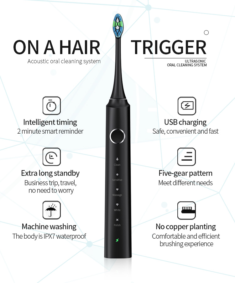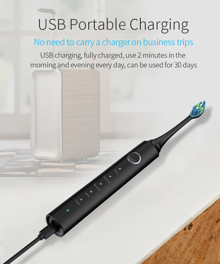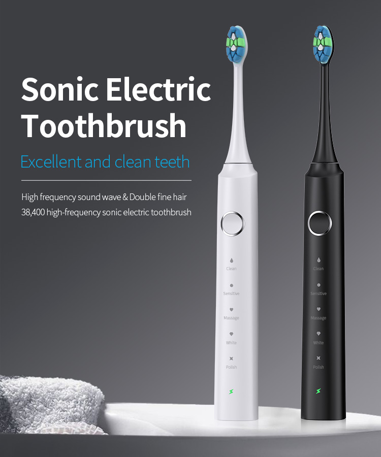 - 5 حالت مسواک زدن با کارایی بالا - تمیز (ملایم)، سفید (قوی)، پولیش (فرکانس معکوس قوی)، ملایم تر (فرکانس معکوس ملایم) و حساس (نرم) متناسب با شرایط مختلف دندان های لثه، بنابراین می توانید حالت های مختلف را انتخاب کنید. با توجه به ترجیحات شما و توصیه های دندانپزشک.