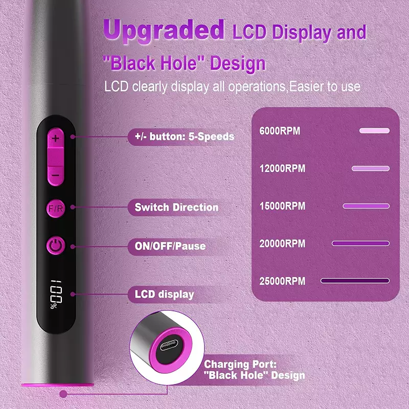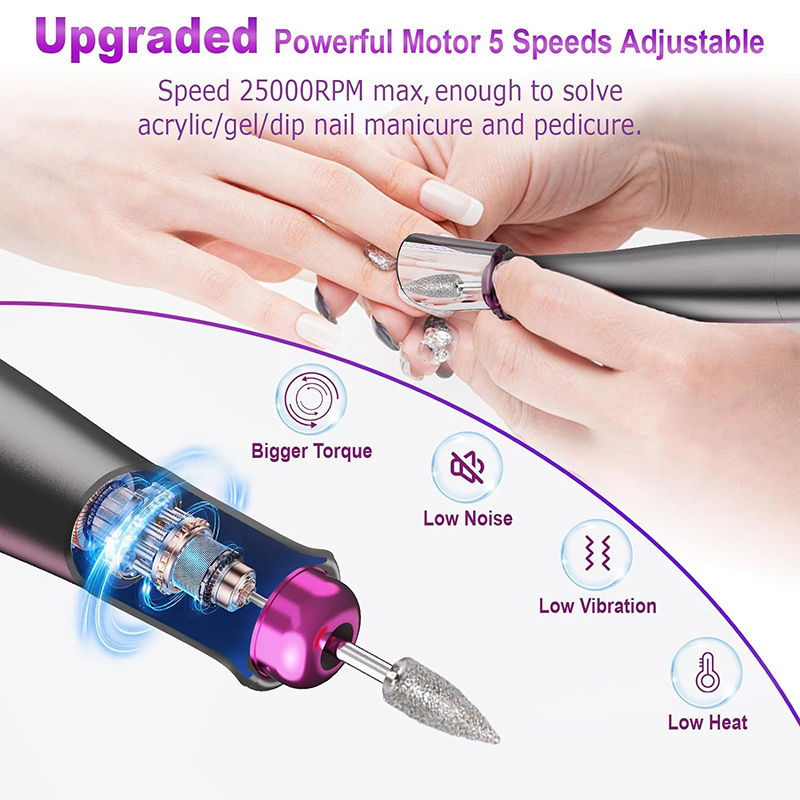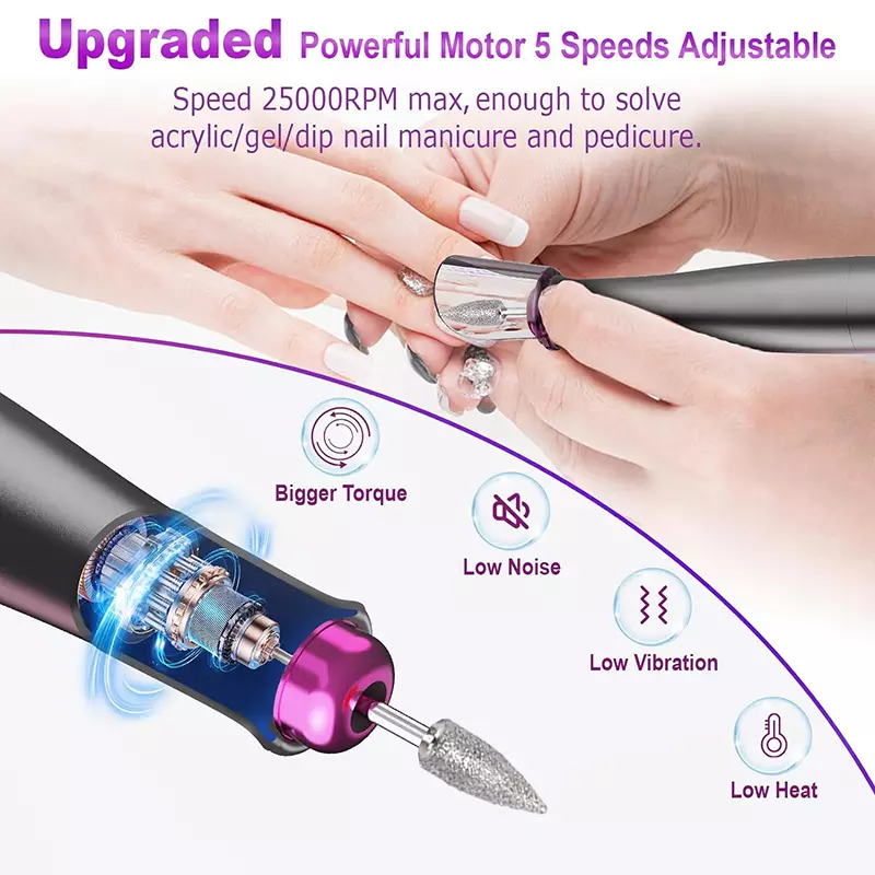 دستگاه مته برقی ناخن موتور قدرتمند ارتقا یافته برای تمام نیازهای مانیکور و پدیکور شما از جمله از بین بردن ناخن های اکریلیک، ناخن های پلی ژل، ژل سوسک ها، ناخن های پودر غوطه ور، کوتیکول ها، پوست مرده، پینه و ناخن های ضخیم عالی است.