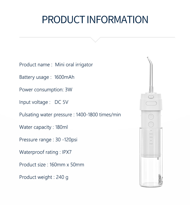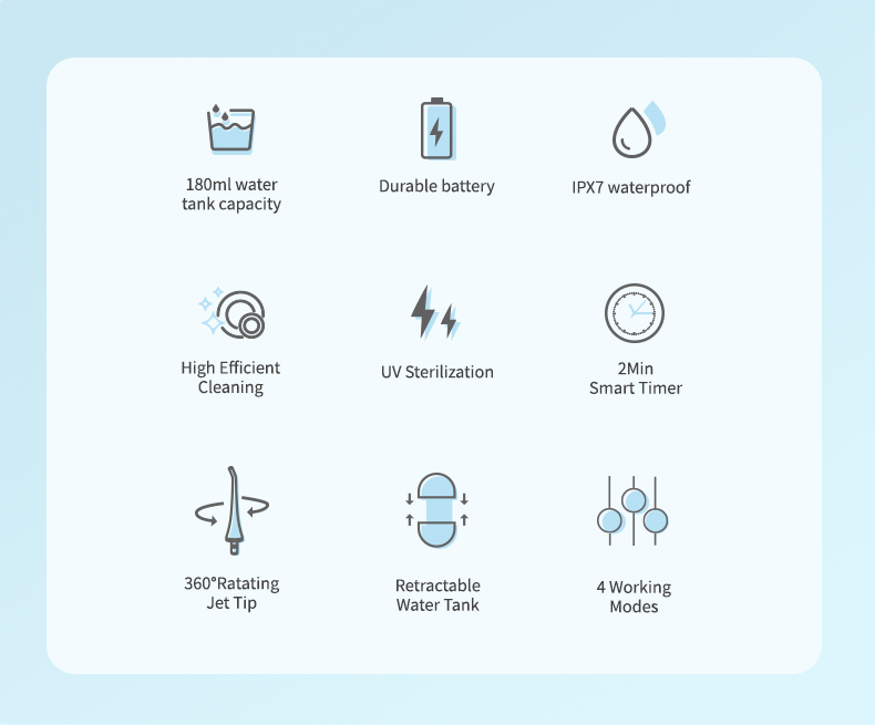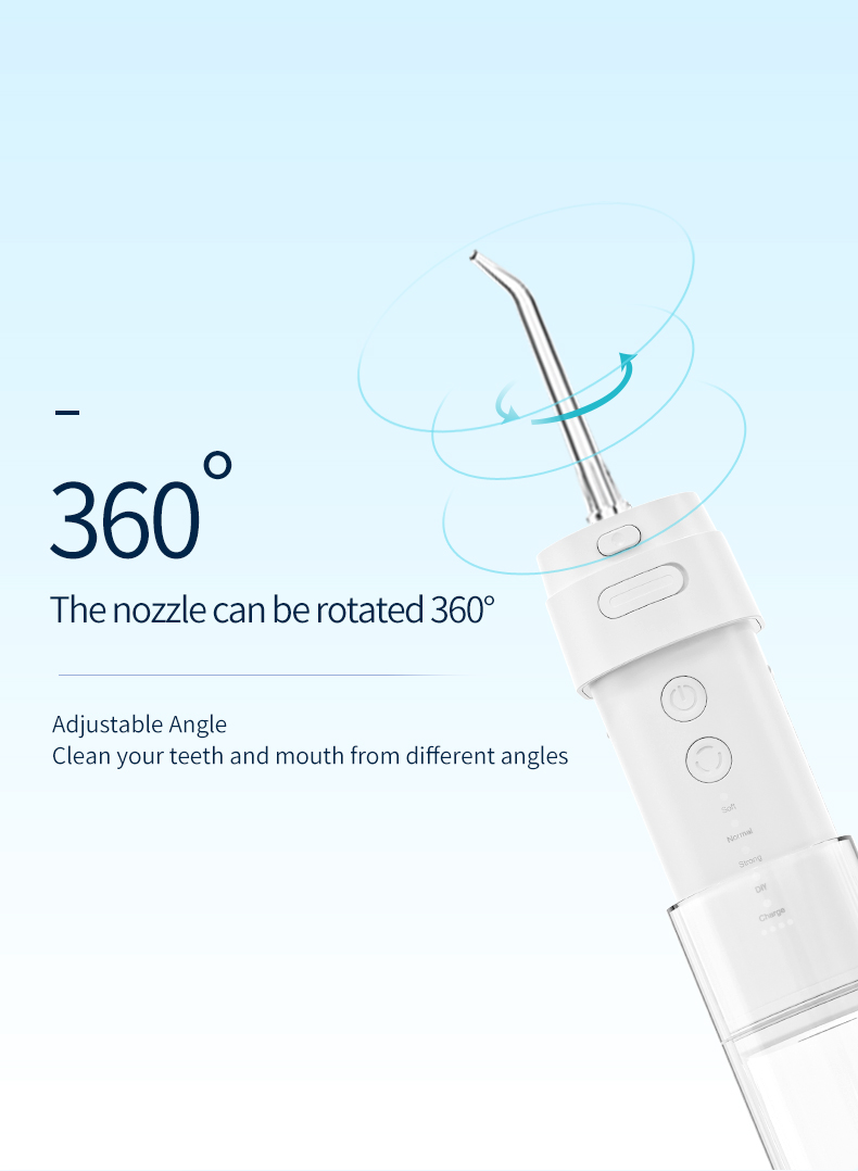 این پین دندانی با نخ دندان، پالسهای فشار آب بالا را با سرعت 1400 تا 1800 بار در دقیقه ارسال میکند و به طور موثر 99.9 درصد از پلاکهای دندانی را برای تمیز کردن عمیق دندانها از بین میبرد. این کلنگ دندانی با نخ دندان، لثه ها را ماساژ می دهد، گردش خون را بهبود می بخشد و مشکلات دهان مانند بوی بد دهان، دندان های ارتودنسی را برطرف می کند.