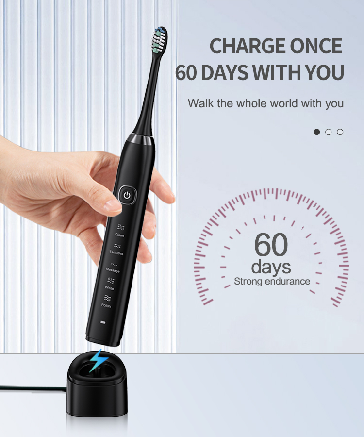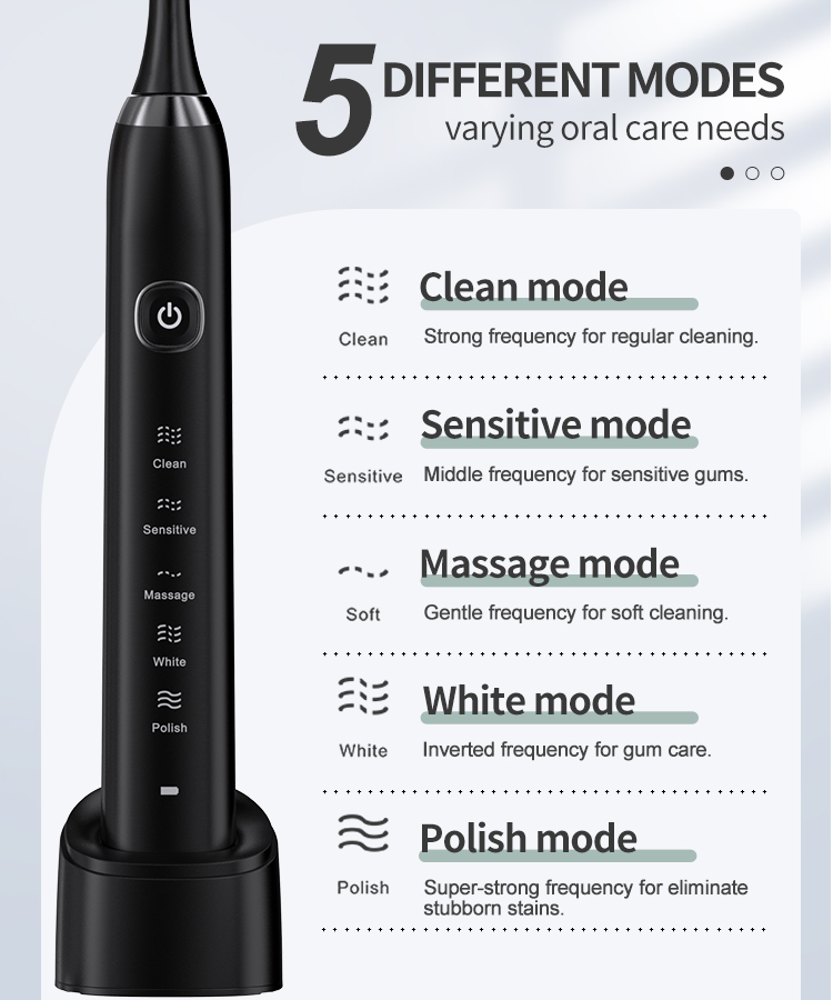 - 5 حالت مسواک زدن با کارایی بالا - تمیز (ملایم)، سفید (قوی)، پولیش (فرکانس معکوس قوی)، ملایم تر (فرکانس معکوس ملایم) و حساس (نرم) متناسب با شرایط مختلف دندان های لثه، بنابراین می توانید حالت های مختلف را انتخاب کنید. با توجه به ترجیحات شما و توصیه های دندانپزشک.