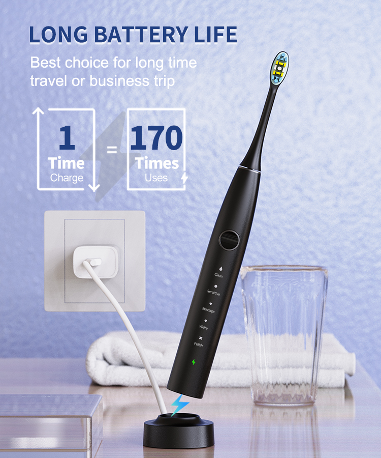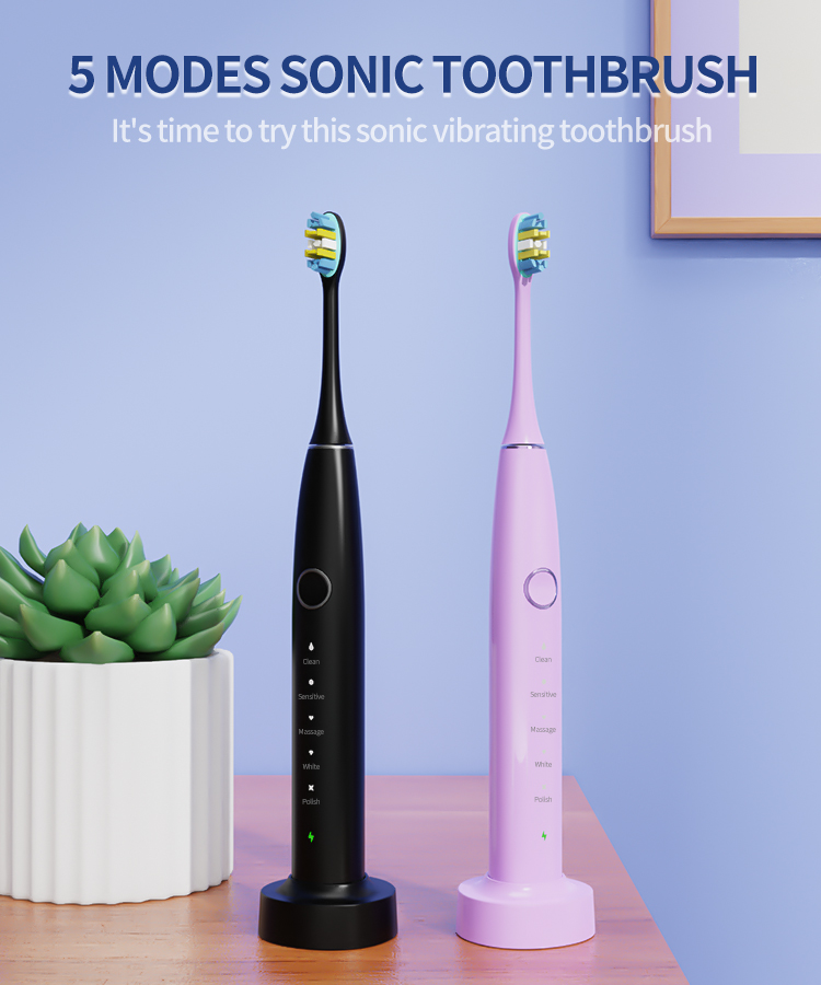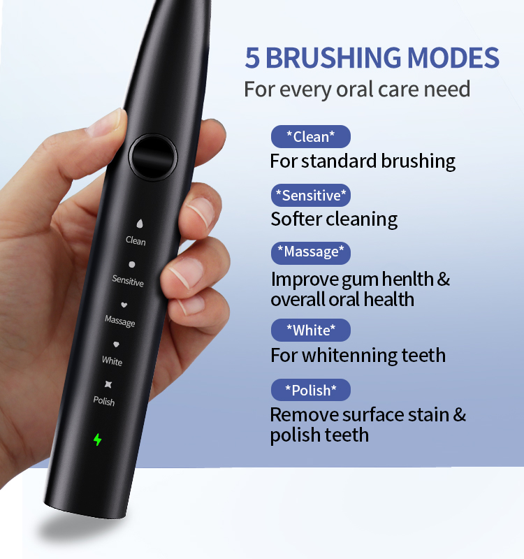 - 5 حالت مسواک زدن با کارایی بالا - تمیز (ملایم)، سفید (قوی)، پولیش (فرکانس معکوس قوی)، ملایم تر (فرکانس معکوس ملایم) و حساس (نرم) متناسب با شرایط مختلف دندان های لثه، بنابراین می توانید حالت های مختلف را انتخاب کنید. با توجه به ترجیحات شما و توصیه های دندانپزشک.