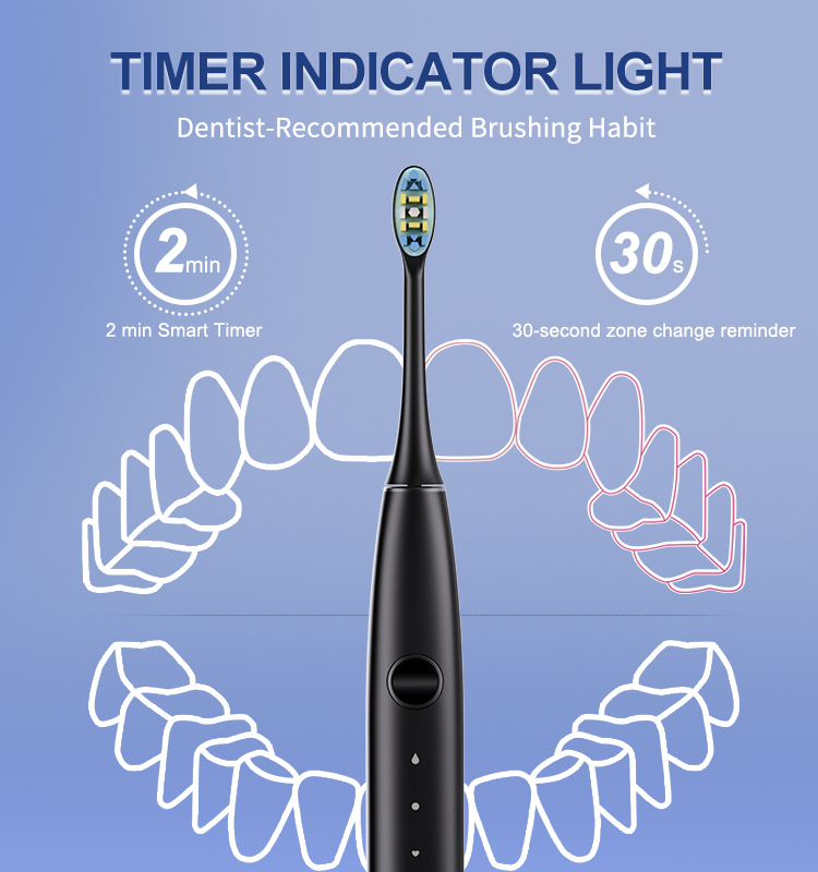 - تایمر اعلان ارتعاشی هوشمند - دارای کنترل تایمر هوشمند، با فاصله 30 ثانیه ای که به شما یادآوری می کند که به ربع بعدی دهان خود بروید و کاملاً در 2 دقیقه (4 ربع)، که توسط دندانپزشکان حرفه ای به عنوان یک روش صحیح مسواک زدن توصیه می شود.
